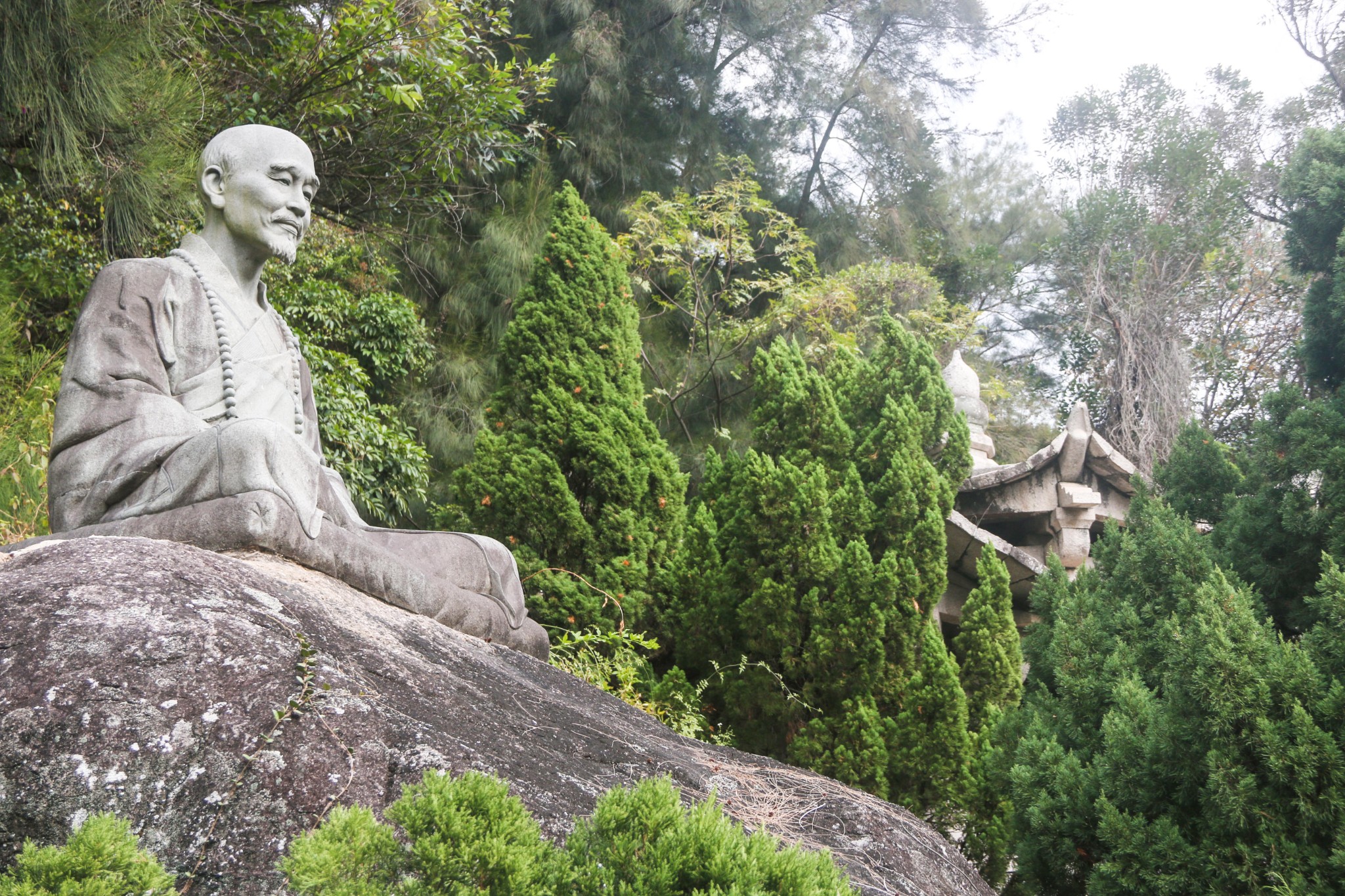 在弘一法师舍利塔附近的岩石,一尊石像上盘膝坐于其上。大师脸庞削瘦,双眼平视,微微皱起的眉头似乎在洞察着世间万事。与法师对视,顿时一种无上清凉的感觉涤荡全身。