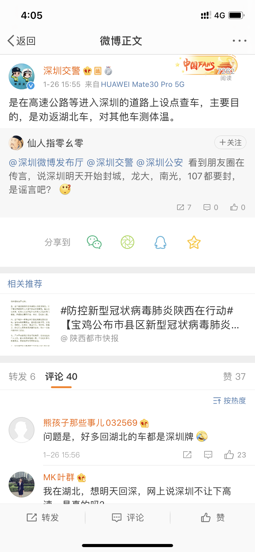 对此,深圳交警部门通过其官方微博回应,近日深圳交警“在高速公路等进入深圳的道路上设点查车,主要目的是劝返湖北车,对其他车测体温。”南方+记者从深圳交警获悉,暂时没有实行交通管制的计划。