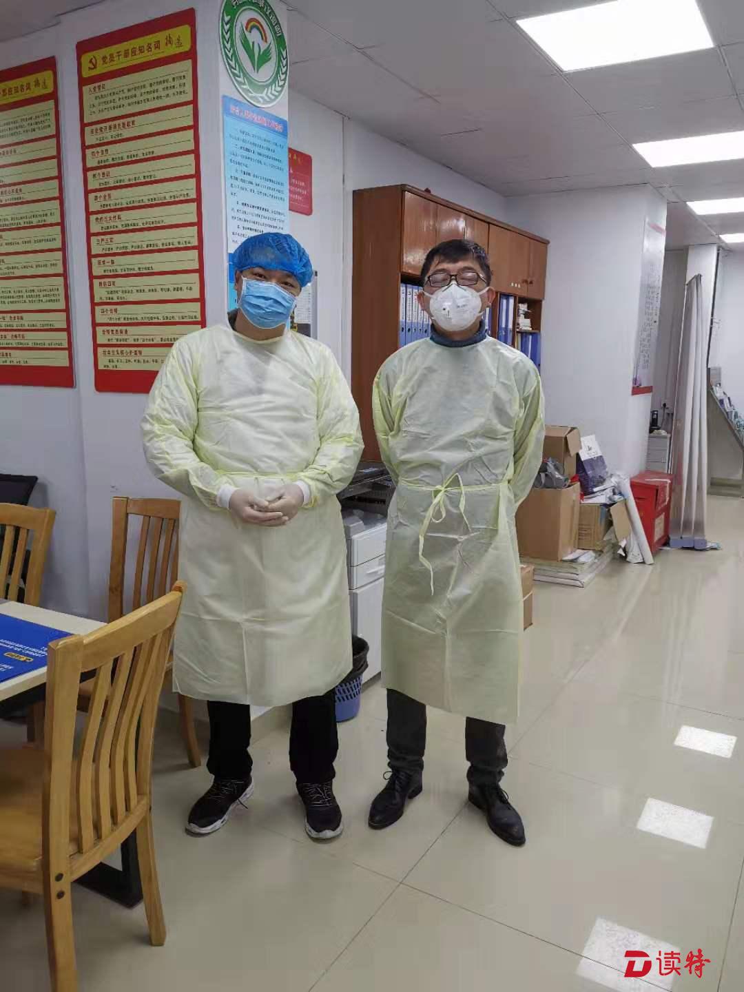 社区党委委员、第二支部书记刘旭昌和东晓社康中心主任朱红刚准备上户为返深人员量体温