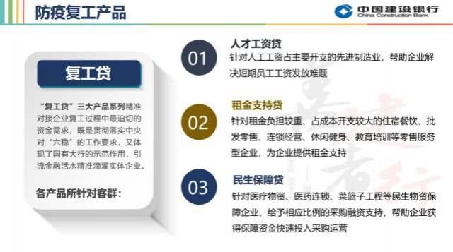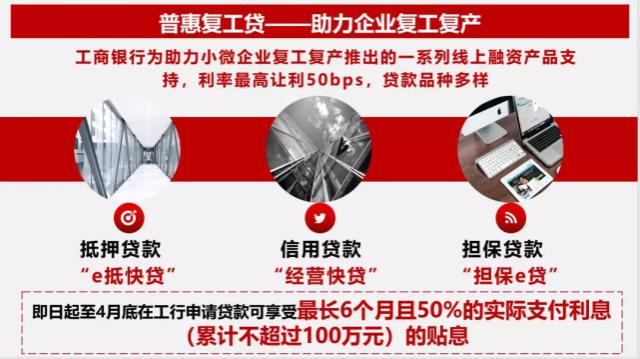 此外,各家金融机构也对中小微企业复工需求,尤其是对生产、运输和销售,应对疫情相关重要医用物资以及重要民生保障物资的企业需求推出相关产品。