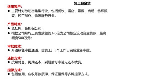 罗湖区内劳动密集型行业,包括餐饮、酒店、景区、商超、纺织服装、轻工制作、物流服务行业分布较广,其中有不少企业的经营受疫情影响大打折扣,如员工滞留外地无法按时返岗,但企业照发工资、不作裁员,资金流动紧张。对于这部分对发放工资有需求的中小企业,金融机构也有相应的特定产品。