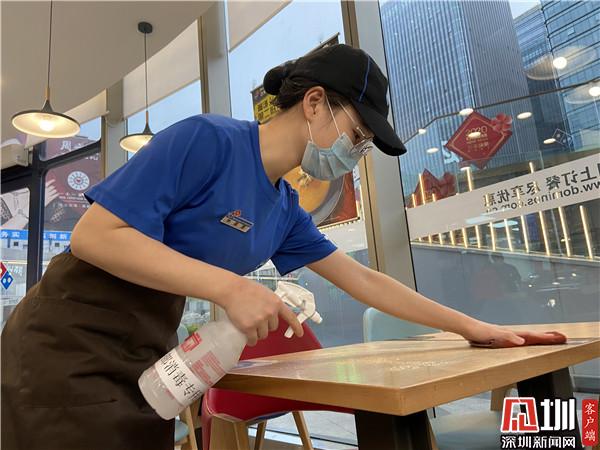 达美乐工作人员对用餐区进行消毒。