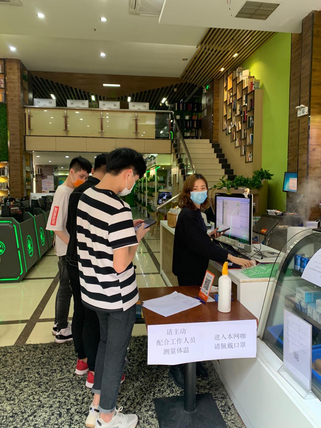 3月23日下午,记者来到位于福田新洲村的微咖网咖。该店在入口处摆放了一张桌子,桌子上贴有两张标语,提醒顾客佩戴口罩并主动配合工作人员测量体温。记者看到,现场有几位顾客正在入口处登记个人信息,而网吧总体顾客不多,顾客之间均保持隔座入座。有工作人员告诉记者,网吧已于22日正式营业,凡是进入网吧的顾客都必须填写个人姓名、体温、进店时间、联系方式以及身份证号,体温无异常者才能够进店消费。为保障正常营业,店内会做好通风、消毒措施,不仅配备免费消毒液供顾客使用,全店每天还会进行清洁消杀。