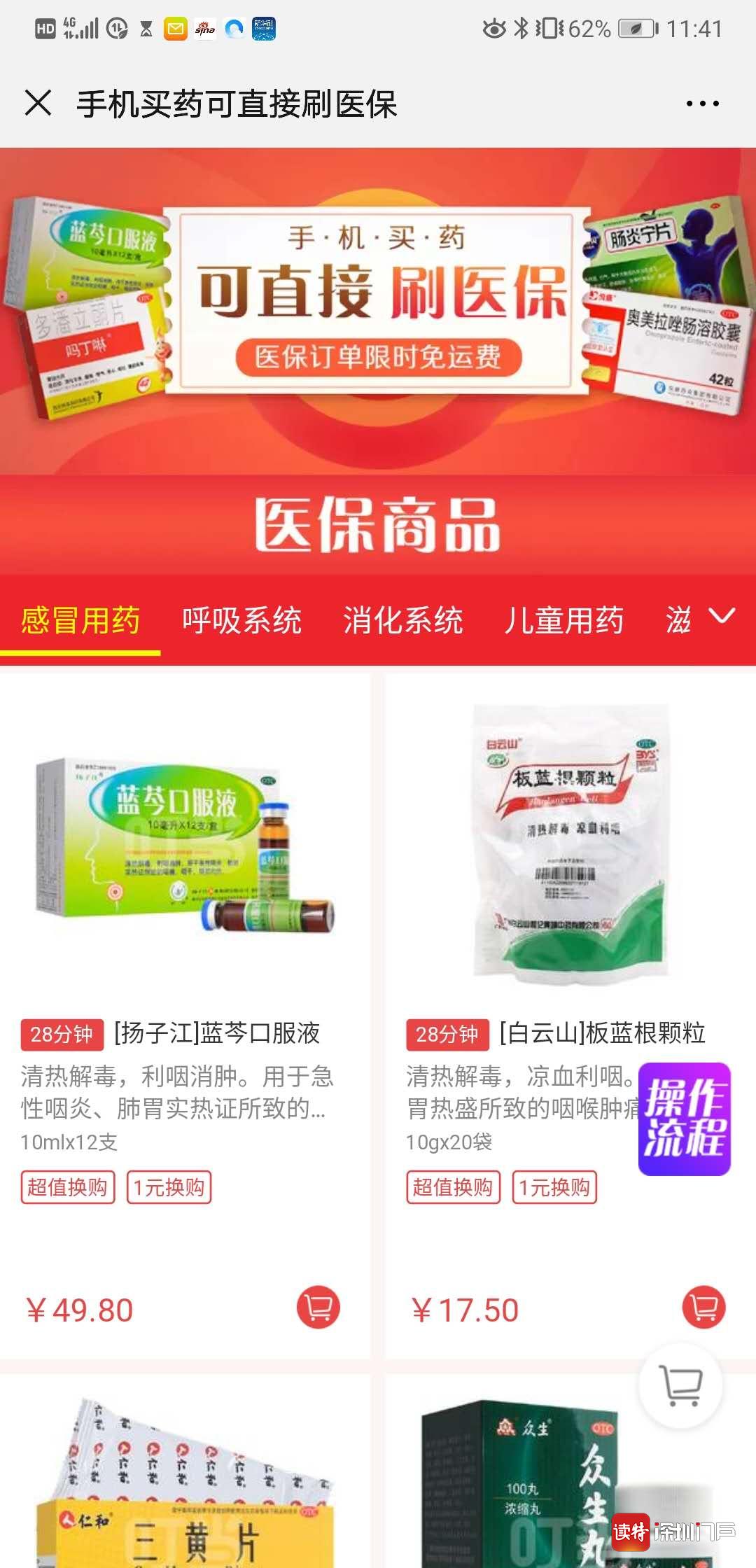 家住福田区的王先生需要买1袋板蓝根,他打开手机登录叮当快药微信商城,选择带有医保标识的白云山牌板蓝根颗粒20袋装,系统显示医保价17.5元,包装费0.5元,免配送费,他按提示绑定医保卡后,用医保卡内的余额支付了17.5元,用微信零钱支付了0.5元包装费,不到半小时叮当快药的配送员就把这袋药品送到了小区门口。
