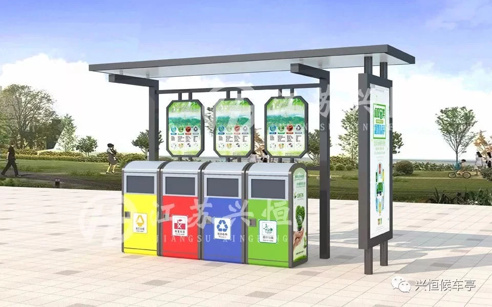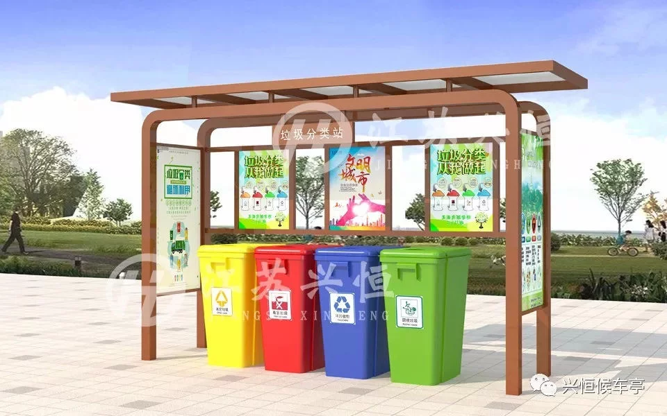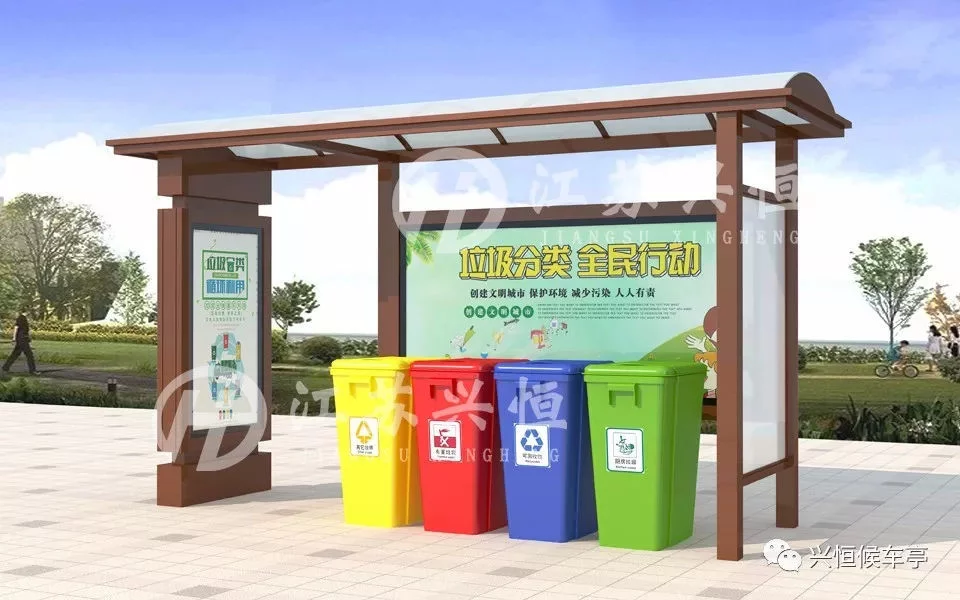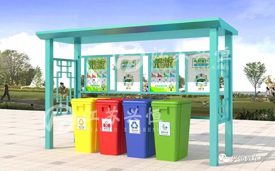 目前,生活垃圾分类收集是城市生活垃圾处置的主流趋势,也是现代城市文明进步的标志之一,有利于提升垃圾清运效率,便于再生资源的回收利用,减少环境污染,缓解环卫工人常规保洁的压力。垃圾分类亭,分为地基基础设施、公益宣传栏、立柱、顶棚等,亭内设置可回收、有害垃圾、厨房垃圾和其他垃圾等垃圾桶,垃圾桶及宣传栏配有垃圾分类的宣传标语,广大群众可以根据垃圾桶的提示标语,将废弃的生活垃圾投放到对应的垃圾桶中。