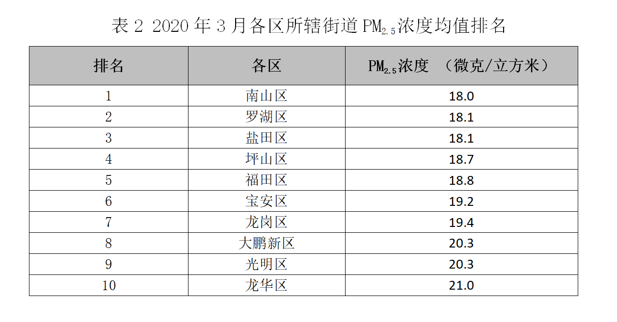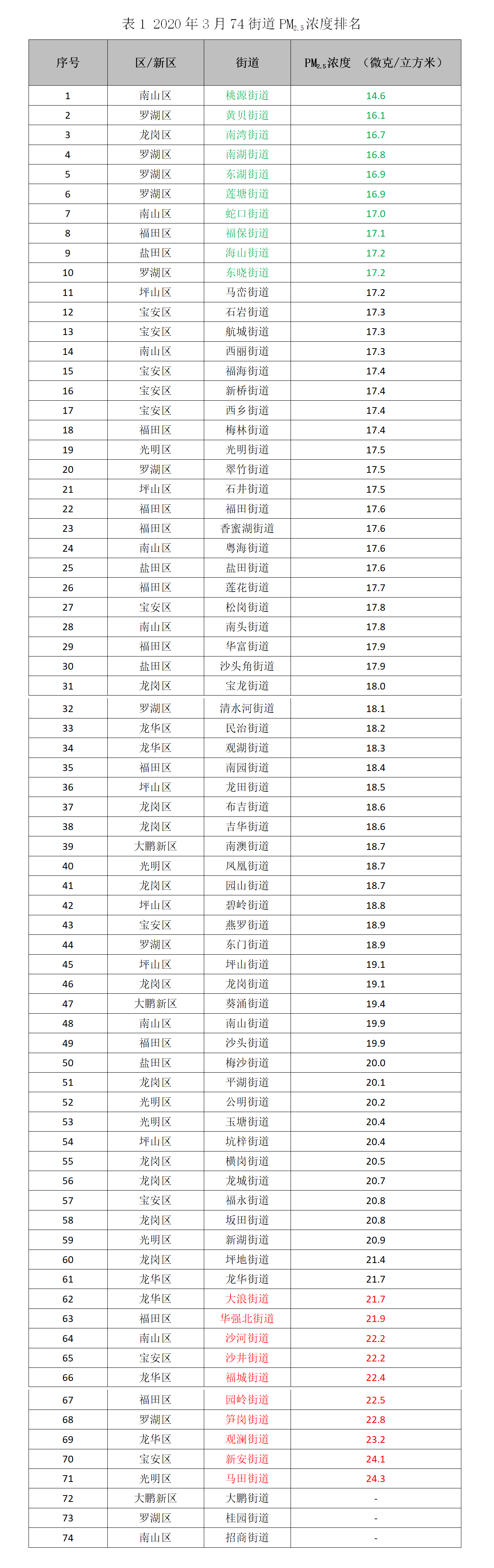 4月21日,深圳市生态环境局发布今年3月份74街道PM2.5浓度排名,南山区桃源街道空气质量最优,排名第一,光明区马田街道排名垫底。
