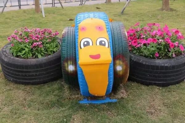 小蜗牛是用废旧轮胎做的,蝴蝶花盆也是用轮胎围成的,地上印着垃圾分类图画……近日,龙岗区园山街道新园路街心公园建成开放,这是深圳市首个垃圾分类主题公园。