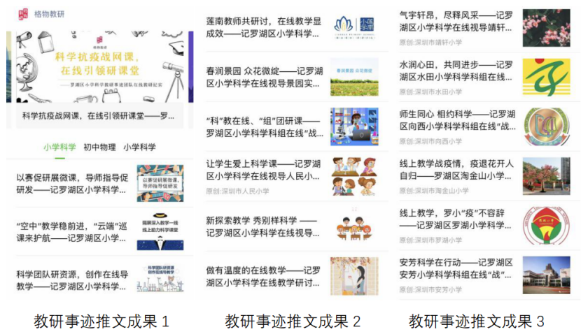 凝聚罗湖区科学科组集体的智慧,发挥集体力量,为推进疫情期间区科学学科教研活动的科学化和规范化,保证科学学科线上教学的有效开展,提高线上教学的质量和效率,教研事迹团队一方面联系各个学校科学科组,协助各校科学老师们制作分享本校疫情期间关于组织教学的科组事迹、好人好事和先进教研措施等,另一方面指导制作了教研员在线视导、教研专家组在线巡课等推文。推文通过“格物教研“公众号推送,让更多的老师、家长、学生了解罗湖科学人在线“战”网课的优秀事迹。