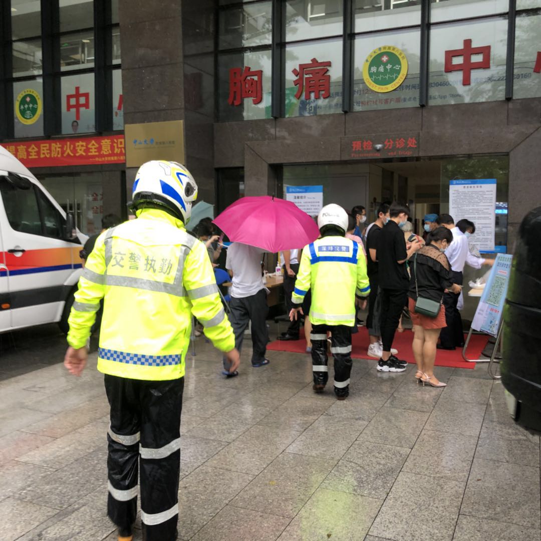 6月8日早高峰,一波强降水席卷深圳,路段积水,车多缓行。此时,在文锦北路洪湖公园门口,四部交警铁骑闪着警灯、鸣着警笛,护送着一部银色轿车迅速赶往中山大学附属第八医院。十分钟后,轿车上一名患者被紧急送进了医院急诊。