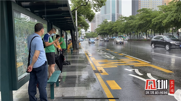 罗湖区某公交站台前,不少行人在遮雨棚下看着近在咫尺的暴雨,淡定地等待车辆。