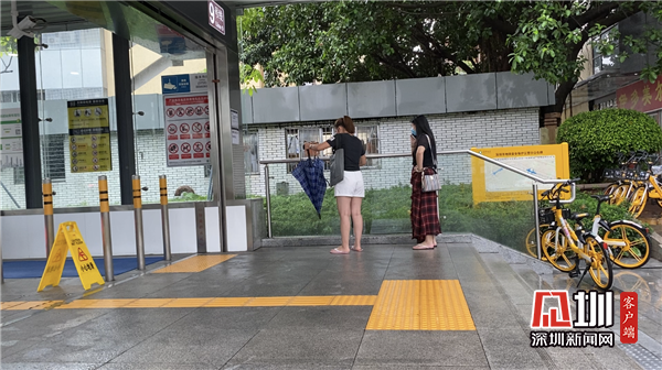进地铁前,两位女士仔细抖了抖雨伞,以免造成地铁内路面湿滑,轻轻的十秒举动展现了“深圳文明”。