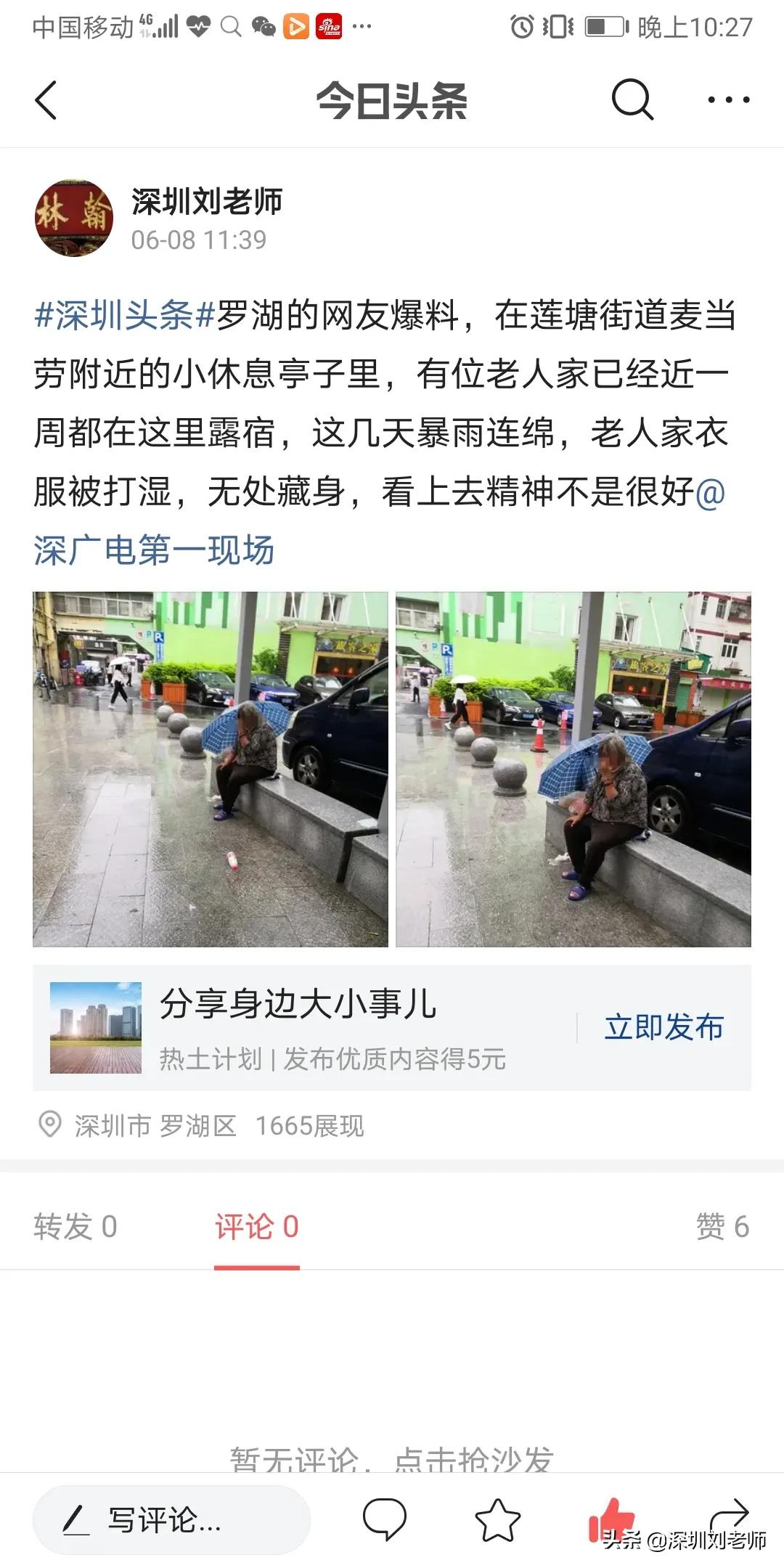 前几天发布了关于罗湖莲塘街道露宿老人的信息,现在老人家还在这个地方露宿,精神看上去是有点问题,请民政局工作人员来了解老人情况