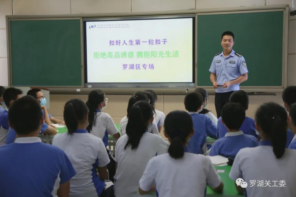 6 月 18 日,深圳市关工委组织 " 银发禁毒宣讲团 " 成员到罗湖区开展禁毒知识宣讲,罗湖外语初中学校 54 名学生参加讲座。