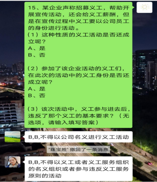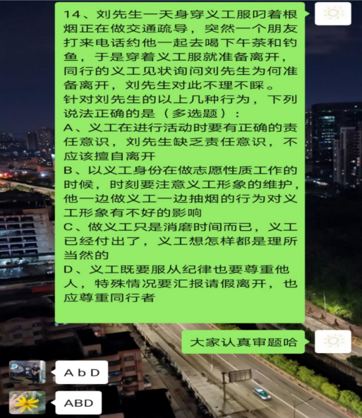 活动以义工基础知识答题竞赛,义工视频共享,讨论分享与建议三个流程进行。方便快捷的微信功能也让义工朋友们更加投入,答题竞赛一开始便如火如荼。