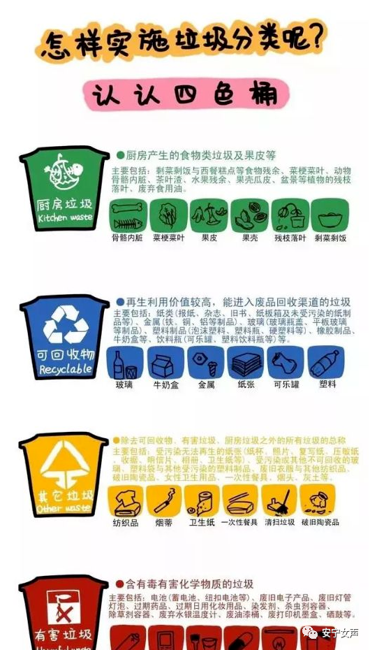 [size=0.17]生活垃圾一般按照可回收物、有害垃圾、厨余垃圾、其它垃圾进行“四分类”。