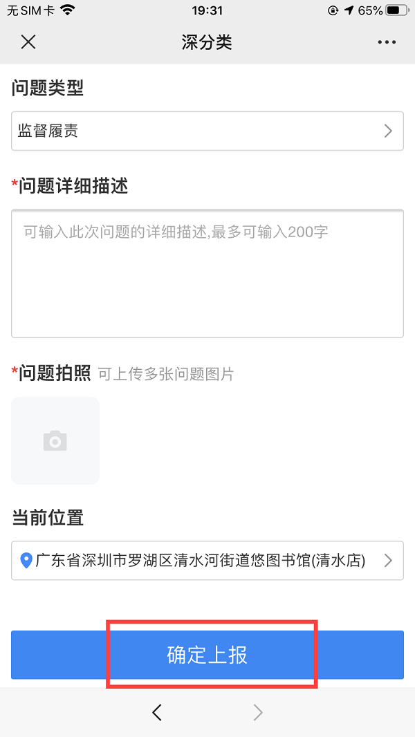 如实填写问题类型、内容描述、图片、地址等信息,点击“确定上报”后即可完成监督件。