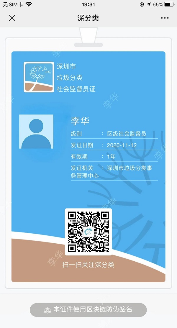 即可查看自己的社会监督员证件信息,该电子名片证件带区块链防伪签名。