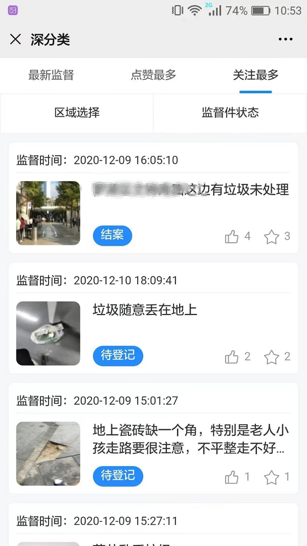 可点击顶端“最新监督”、“点赞最多”、“关注最多”栏目,分别查看最新上报、点赞数、关注数排行。
