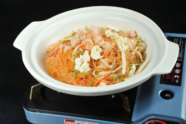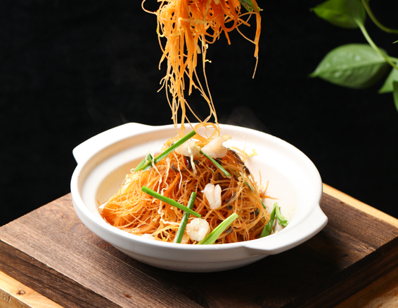 配上海鲜,宾客们都说能吃出鱼翅的味道海皇干捞粉丝是重磅新菜品,是很多新老顾客朋友聚餐、请客必点一道菜。金灿灿的海皇干捞粉,干爽而不腻的口感十分美妙,这也是一道经典的港粤料理菜式。味道鲜中带辣,具有色泽红亮、鲜味浓厚、醇香微辣的特点。海鲜酱的鲜味搭配上粉丝的脆,再加上鱿鱼丝和基围虾粒的鲜香口感,光闻着味,就让人食欲大动。