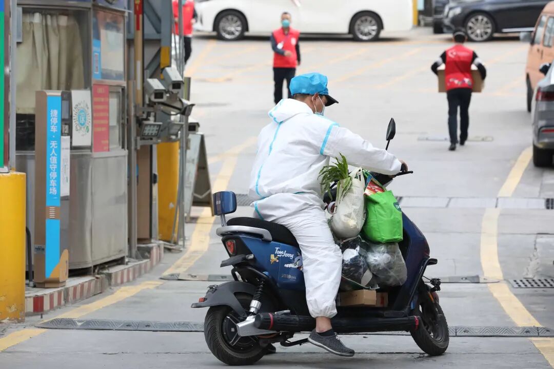 1月8日15时25分,在布吉壹村东心岭,工作人员陆续将居民购买的外卖、快递及其他生活物资送到居民手中。张焱焱 摄