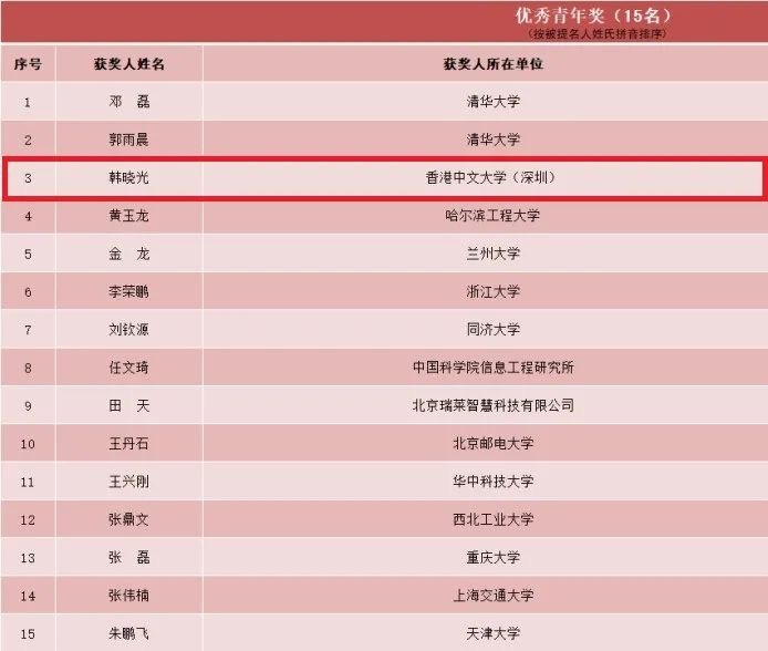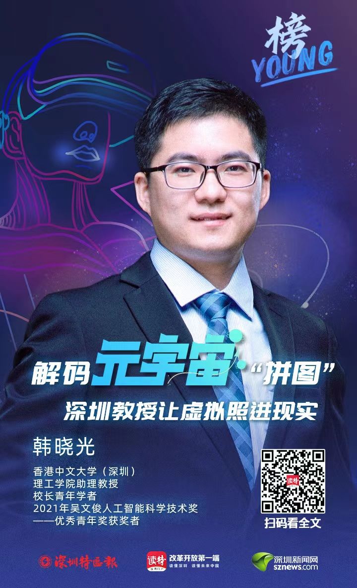 2022年1月17日,2021年度第十一届吴文俊人工智能科学技术奖获奖名单在其官网公示,33岁的韩晓光博士荣获优秀青年奖,成为香港中文大学(深圳)首位获得该奖项的青年教授。