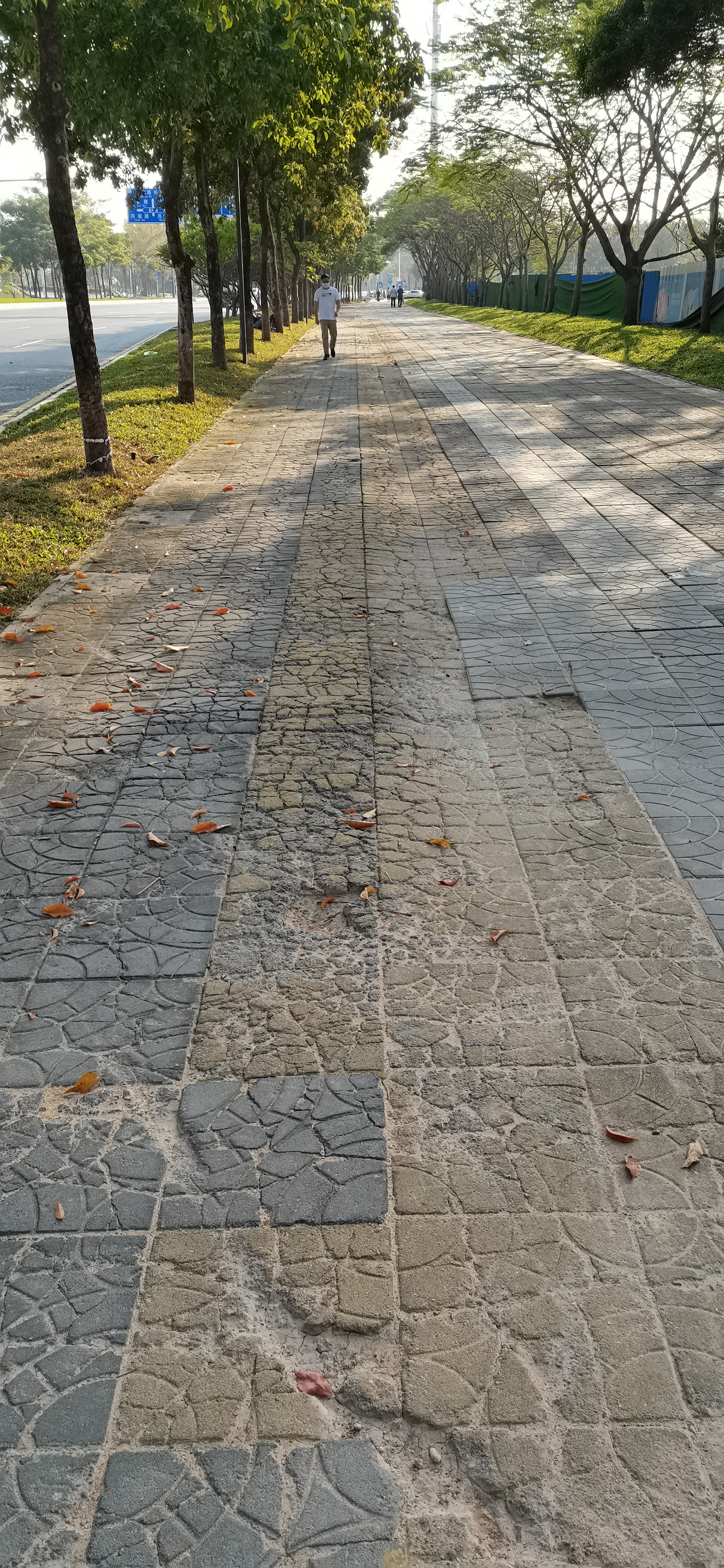 以上图片是北环大道的北面,现在我们下面的图片是北环大道的南面,还没有改造。南面,是以前这种地砖,虽然被压得破破烂烂,但是并没有脱离地面,看起来很紧实。