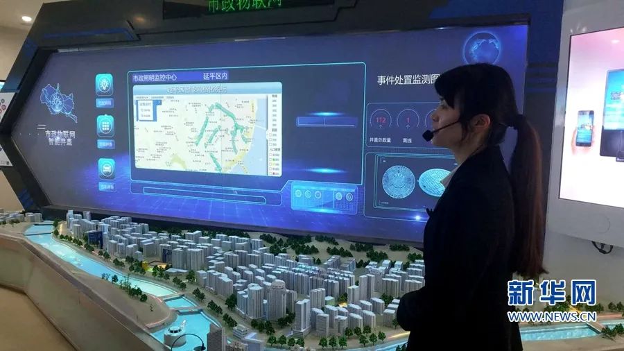 工作人员在沙盘前介绍如何将物联网技术运用在市政管理领域。新华网 刘默涵 摄