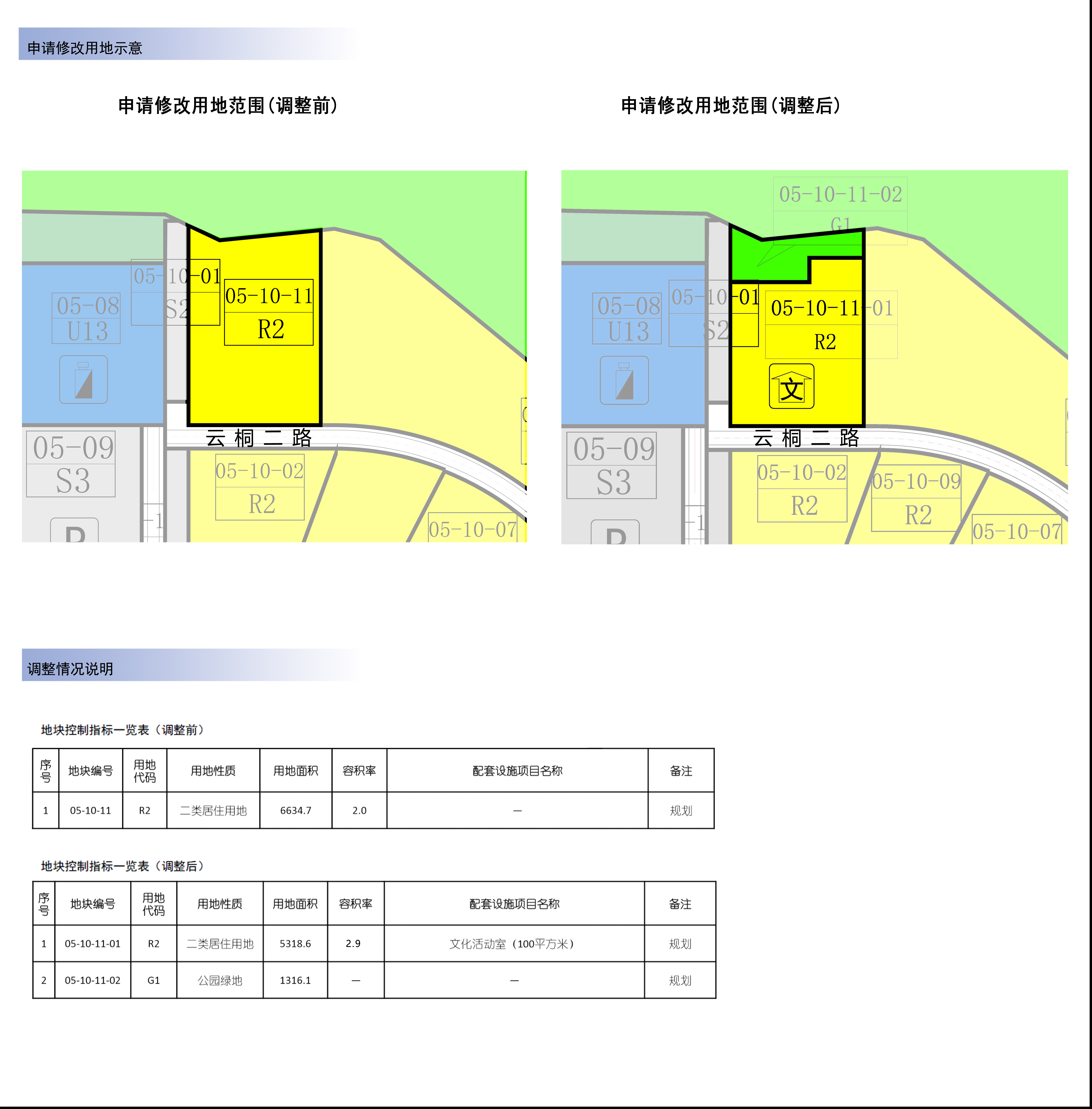 拟对[莲塘地区]法定图则05-10-11地块进行规划调整,并按《深圳市城市规划标准与准则》(2014)表达。将05-10-11地块调整为两个地块(05-10-11-01和05-10-11-02地块)。05-10-11-02地块规划用地性质为公园绿地(G1),用地面积为1316平方米,容积率--,配套设施--,备注为规划;05-10-11-01地块规划用地性质为二类居住用地(R2),用地面积5318平方米,容积率≤2.9,配套设施为文化活动室100平方米。