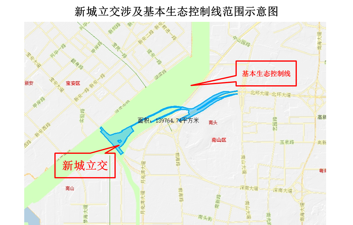 新城立交完善工程位于前海合作区、宝安区与南山区交界处,是南坪快速二期(接桂湾一路)与宝安大道(接深南大道)的衔接点(详见附件1)。现状两条主线均已建成,本项目主要对立交相关转向匝道进行完善。本项目法定图则局部调整及规划设计条件研究已经深圳市规划和自然资源局业务会审议并原则通过,现根据《中华人民共和国城乡规划法》、《深圳市城市规划条例》、《深圳市基本生态控制线管理规定》等相关规定,对本项目法定图则局部调整方案、规划设计条件及占用基本生态控制线公示如下: