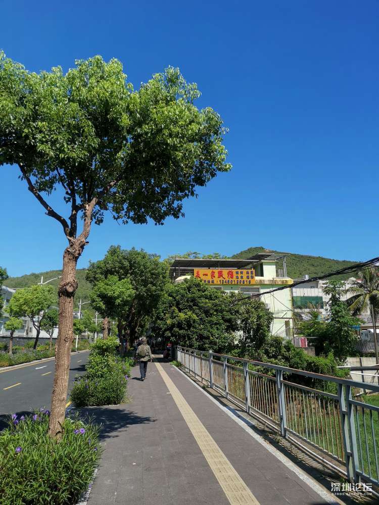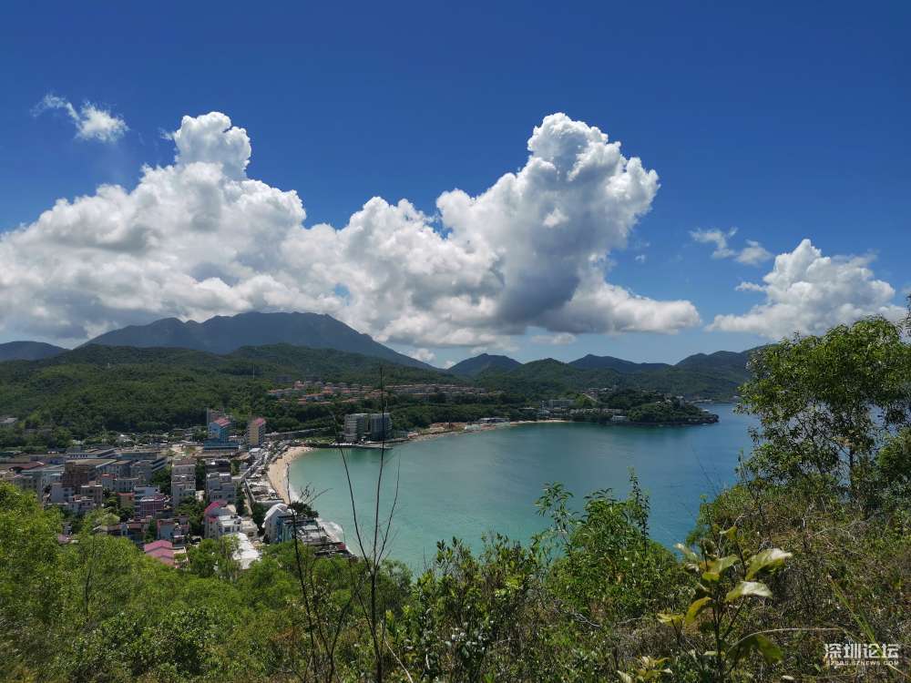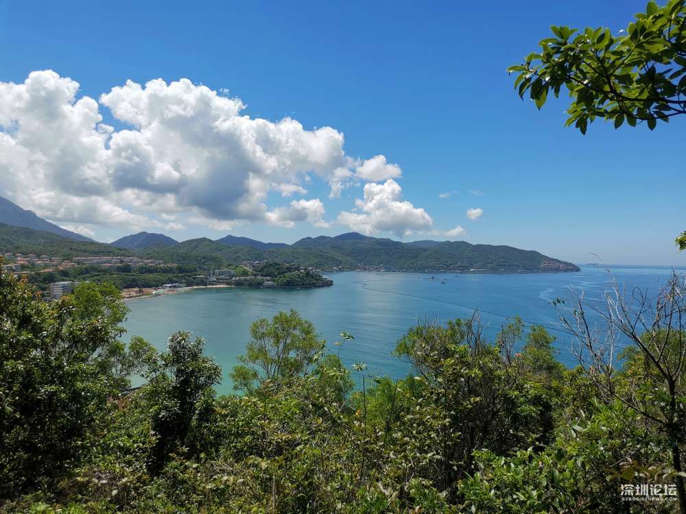 郊野径起点有地图牌,上面有路线路程时间提示,英管岭海拔239米,视野非常开阔,可看梧桐山、梅沙尖、排牙山、七娘山、抛狗岭、香港蚺蛇尖等山峰、大鹏湾、月亮湾、羊畴湾、大澳湾、较场尾、金沙湾、香港东平洲岛……英管岭观景平台往云海山庄沿途有很多造型不错的大石头,地图牌和沿途所见都写的云海山庄,但实际我们是从鹏海山庄出来,虽然鹏海山庄和云海山庄大门是挨着,从大门出来时,保安问我们从哪来的,我们说从山上下来,然后被查看了健康码,说现在疫情是不可以进去的,也看到云海山庄门前的公告山庄和泳滩都是关闭的,看来这路线如反正目前行不通。