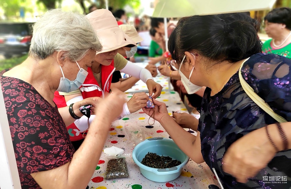 制作驱虫香包是端午节的传统习俗之一。“大家把艾草理一理,像这样搭配在一起……”社区工作人员热心地向居民讲解香包的制作方法,大家一起合作,动手包起手中的艾草香包。艾草被精心装扮,配上玉簪叶、菖蒲等草药,不一会儿就在居民手中变成了既好看又能驱虫辟邪的香包。
