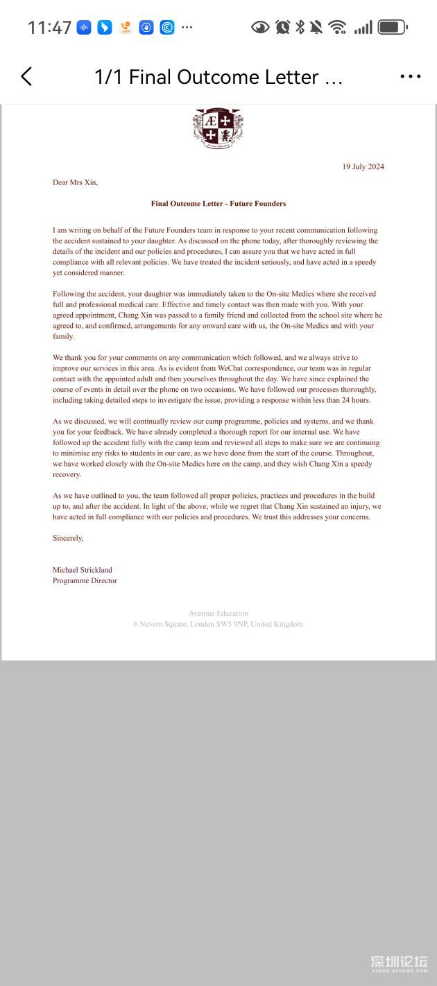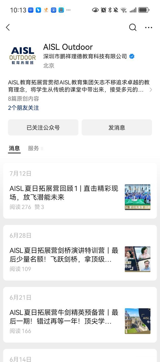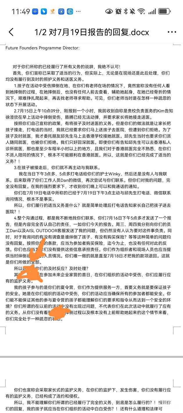 我们通过深圳市鹏祥理德教育科技有限公司设置的公众号推送的AISL教育拓展营 未来企业家营活动,经咨询过其客服后,通过网购方式购买了2024年7月15日-20日在香港的营期活动。2024年7月15日早上,把孩子送到指定的香港哈罗国际学校,宣讲完后,孩子在参加他们组织的活动不到5分钟时间,就严重摔伤骨折。但摔伤当时,没有老师协助她起来,在孩子挣扎起身后寻求老师帮助,他们做了简单处理,就要求家长把孩子接回,而不是马上将孩子送去医院治疗。在家长不得不自深赴港接回孩子治疗后,未再主动联系我们。在家长近一周不断尝试与他们沟通后,他们才勉强回应,退回了学费。孩子称在活动中,有人从后方绊倒了她,导致她腾空后摔倒。但多次交涉后,他们既不能提供现场视频,也不调查到底是谁摔伤了孩子,也不告知是否购买保险等等事宜。仅仅认为他们已经做了一切,不需要承担责任。孩子单独参加研学期间,提供服务方就是第一监护人,他们对于孩子受伤应当承担责任,且应当给与赔偿。在他们已经拒绝道歉赔偿和一切沟通后,我们强烈要求对于深圳市鹏祥理德教育科技有限公司的这种冷漠无情做法予以曝光!