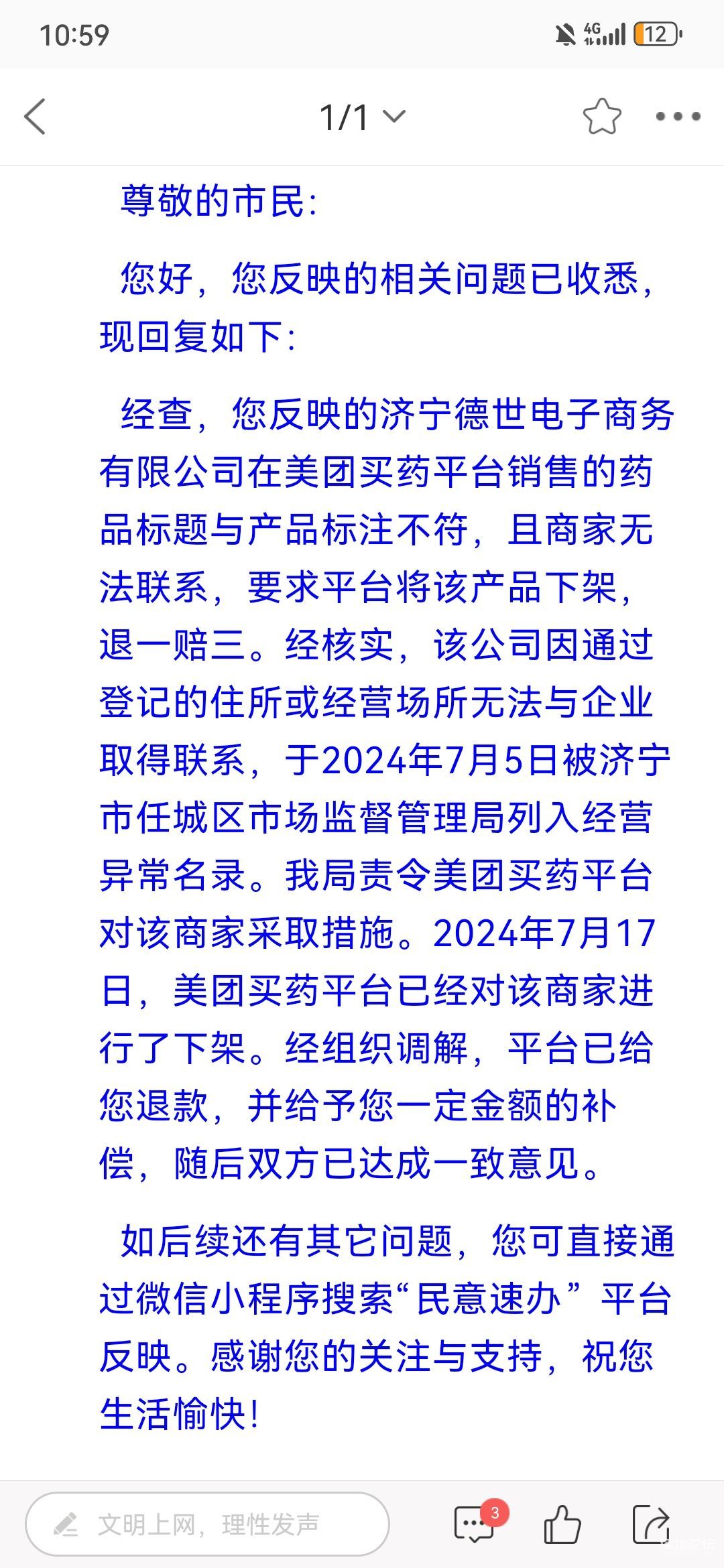 经核实,该公司因通过登记的住所或经营场所无法与企业取得联系,于2024年7月5日被济宁市任城区市场监督管理局列入经营异常名录。我局责令美团买药平台对该商家采取措施。2024年7月17日,美团买药平台已经对该商家进行了下架。7月31日,我局再次联系美团平台与您进行协商,平台给您增加了一定金额的补偿,您已同意。双方已达成一致意见。感谢您对我们工作的监督和支持!