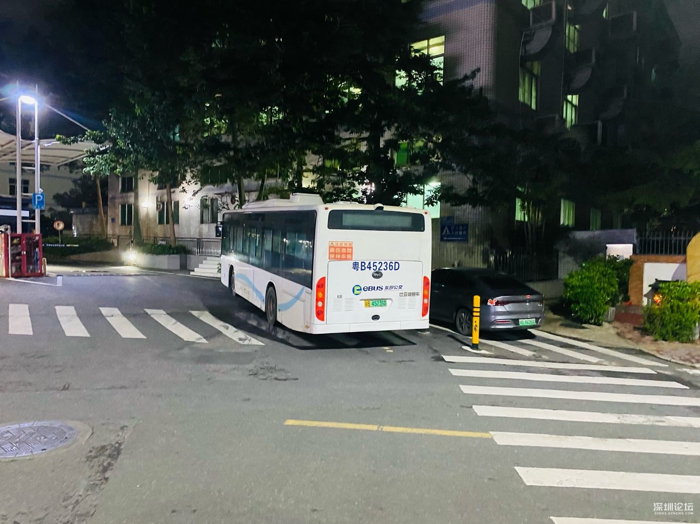 能看到有一台车牌号码为粤B45236D的公交车辆逆行停靠在沙塘布路北行的车道上,其余车辆也有在其他路段停靠过夜