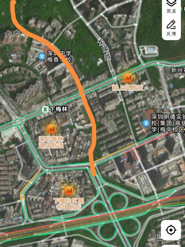如图中橙色线所示,结合河背村旧改,在新洲路北端路口河背村位置开挖隧道,隊道下穿梅林小学操场,沿梅亭路至梅林公园,穿越梅林后山,在北站公园西北侧与留仙大道互通,再往北接民宝路。增一条路,减一分拥堵。