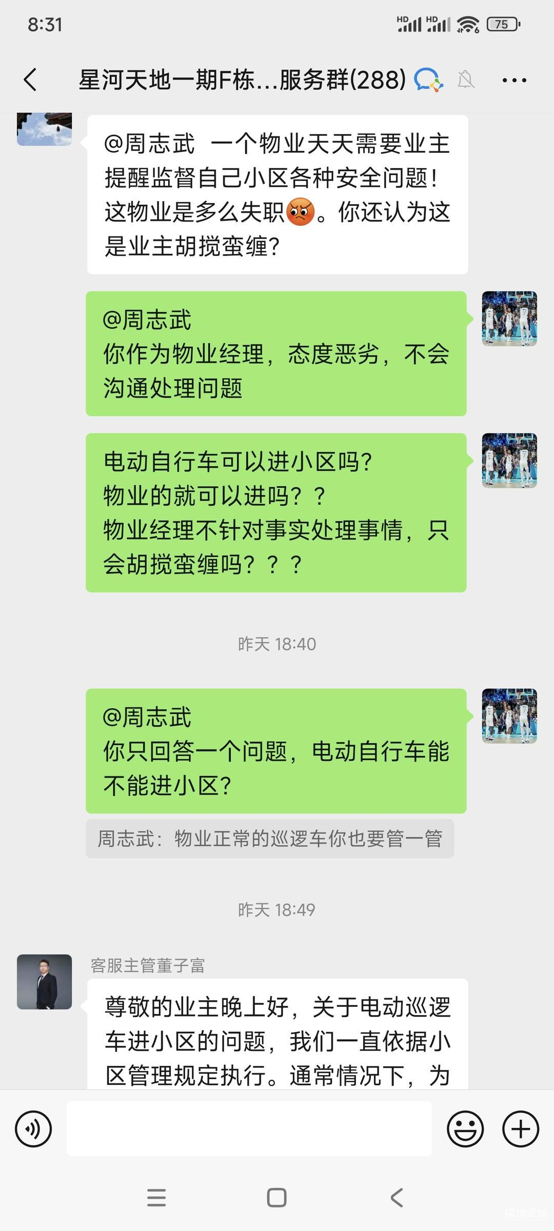 业主在物业群请物业后续不要将电动自行车开入小区,但换来的确实物业经理的野蛮回复,说业主胡搅蛮缠!