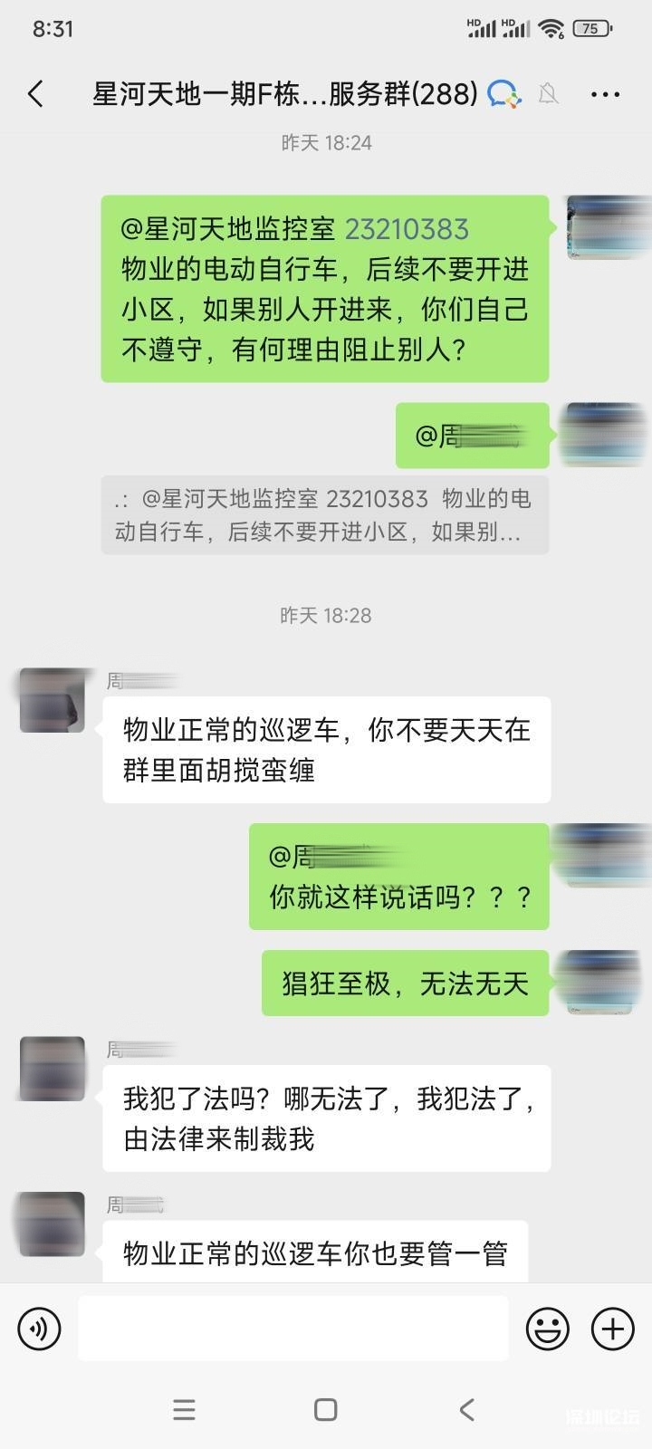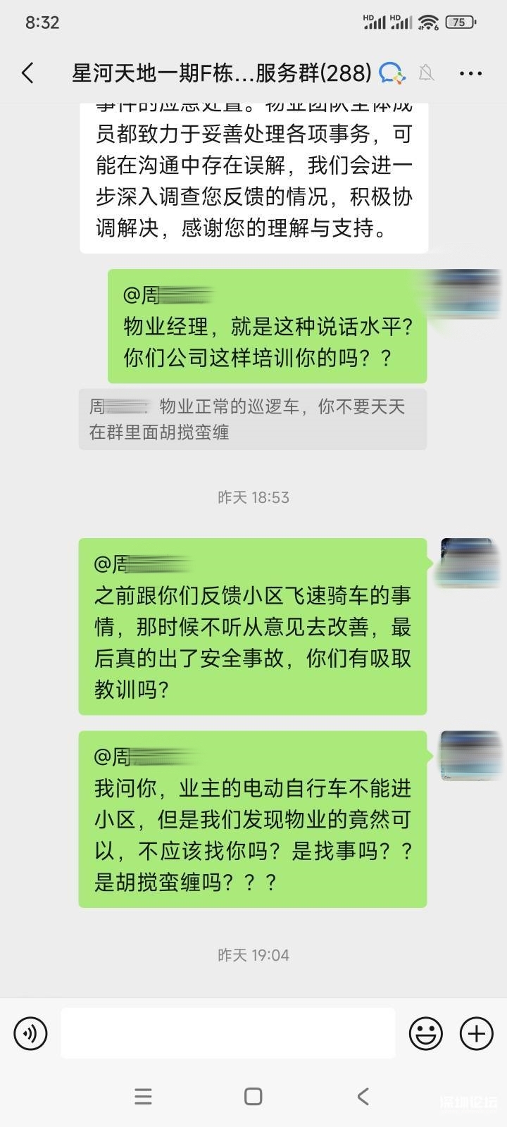 事发于光明区星河天地花园一期,因业主电动自行车禁止驶入小区,故业主请物业也不要将他们的电动自行车开进小区,但换来的确实物业经理态度蛮横的回复,说业主胡搅蛮缠!