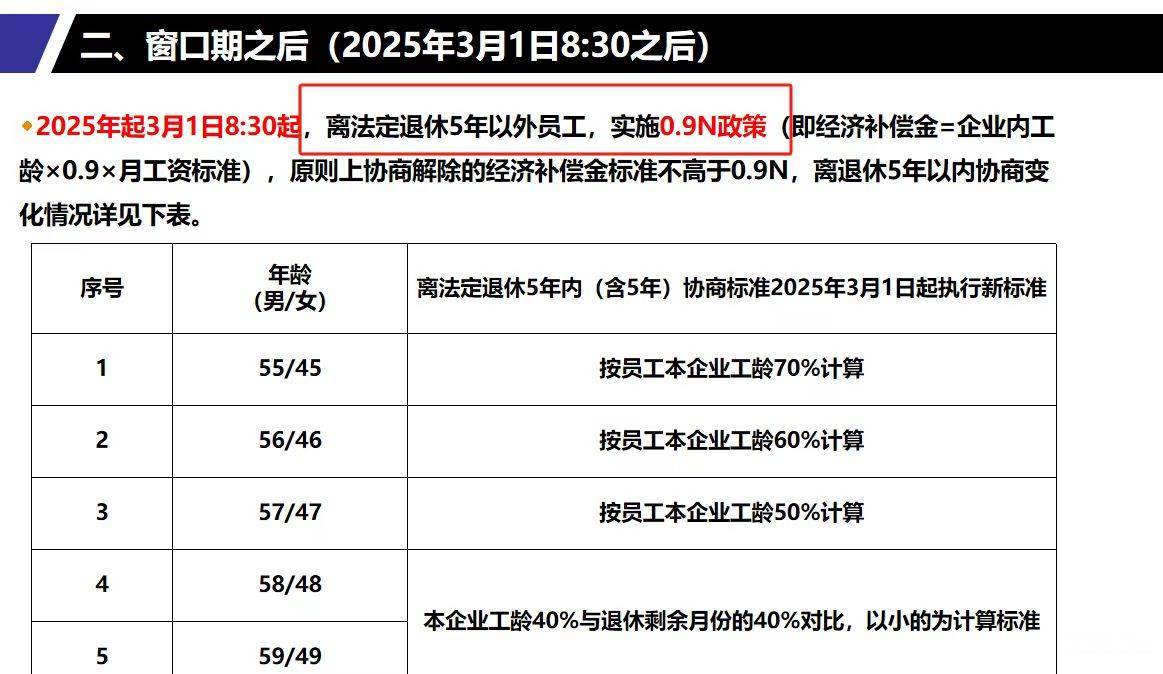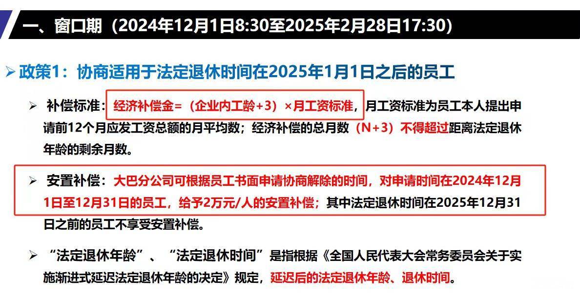 一、窗口期政策,员工在2024年12月1日至12月31日协商解除成功,补偿为(N十3、2万元安置费),法定退休在2025年12月31日之前不享受安置补偿。