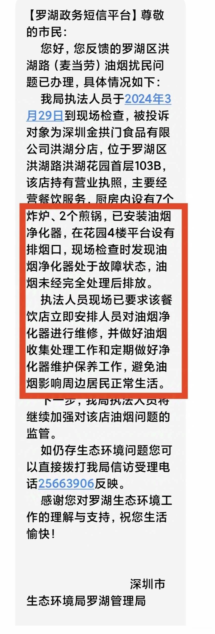 深圳市生态环境局罗湖管理局 发表于 2025-1-3 18:19 尊敬的网民: 您好,关于您反映“罗湖区麦当劳洪湖店油烟扰民问题”,具体办理情况如下: 我局执法人员 ...