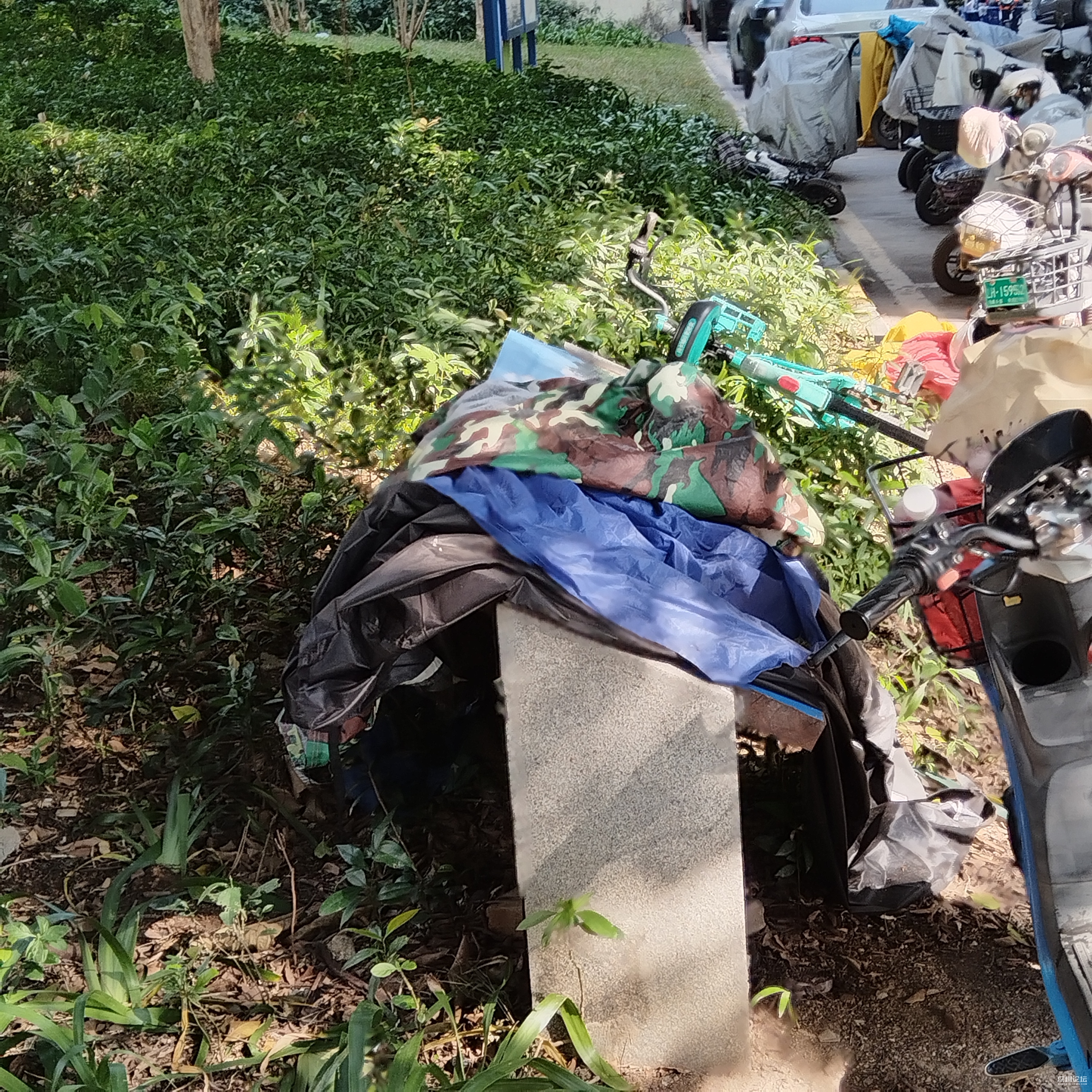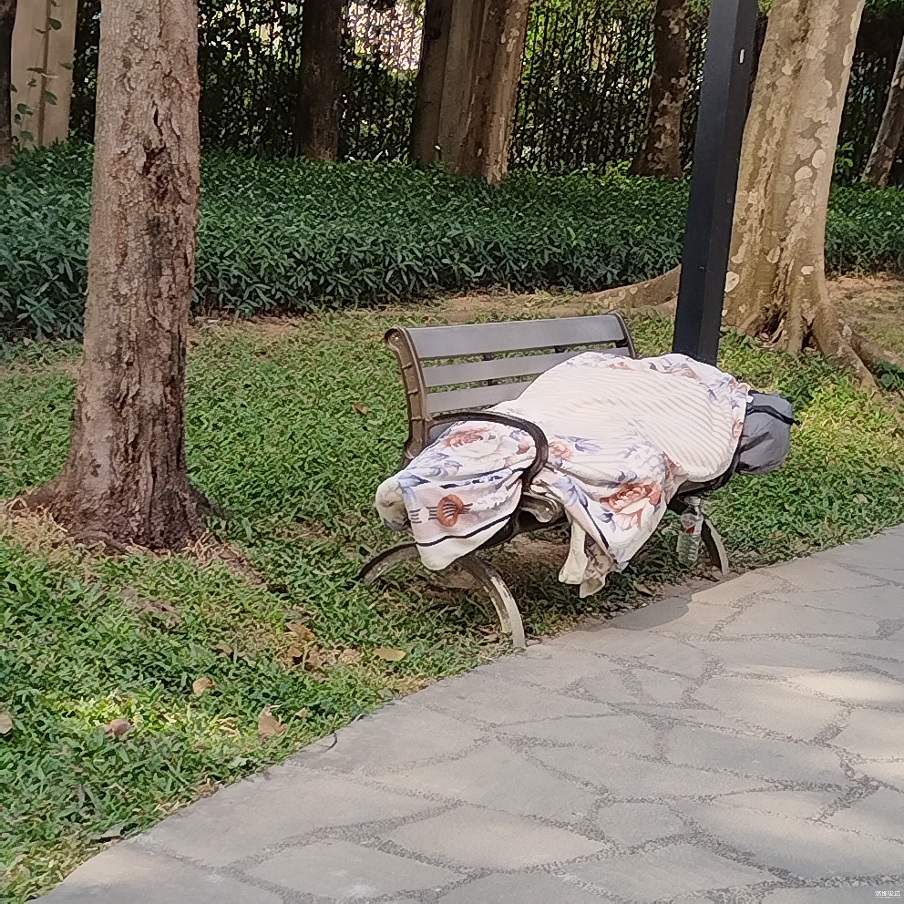 3、岩石公园有个小伙子长年(已经有1-2年了,不知道是不是同一个人)住在公园凳子上(图六),后面的绿化带就是他的流动厕所,社区办公室就在旁边,我建议可以设置一些温馨提示牌,如天气冷了,可以去社区办公室暂时避寒和公共厕所指路牌等;