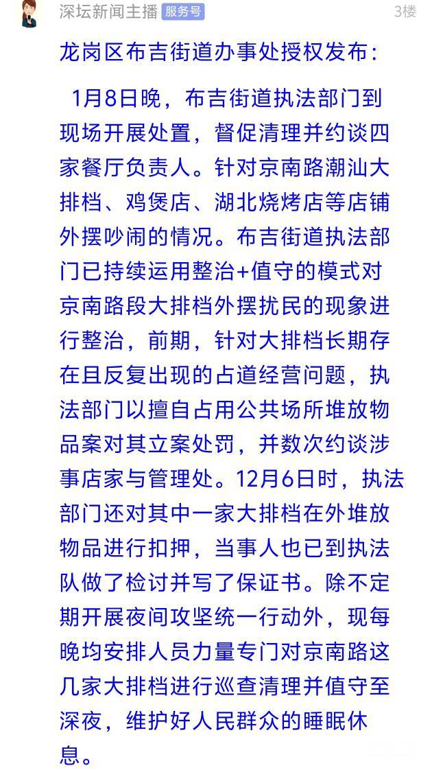 坐标龙岗区布吉街道京南路,以前投诉过一些商家占道经营、乱摆卖、半夜噪音扰民的问题,布吉街道办回复说扣押了物品,还写了保证书。