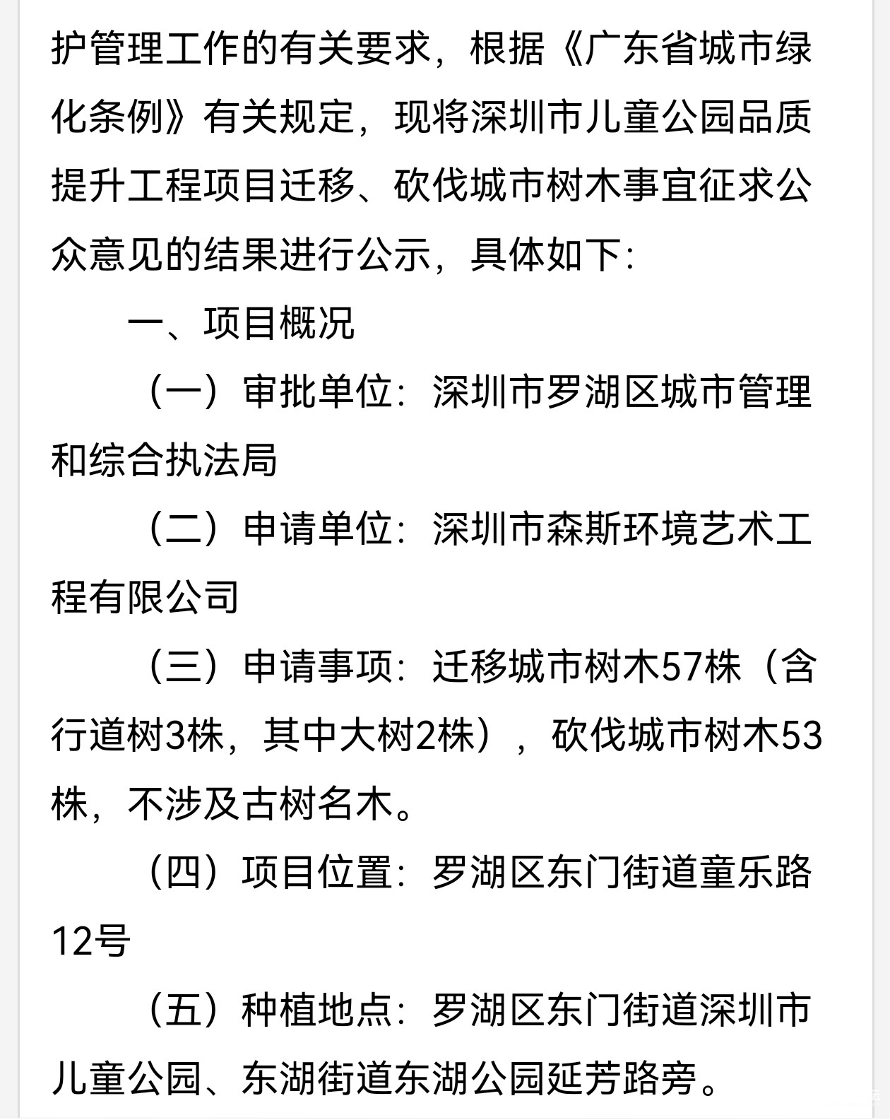 迁移57棵,其中包括2棵大树。砍伐的数量更是达到了53棵!先前经过雅园立交时就有发现公园笋岗路一侧大树被挂上迁移牌。当初改造征求意见时明确表示会保留公园内的一草一木,怎么现在又更改了方案呢?始建于1987年的罗湖区市儿童公园,是许多深圳人的童年回忆,园中大树参天,每一棵树都见证了公园与特区的成长,承载了市民的记忆。希望公园改造保留园内的树木,请保留树木!